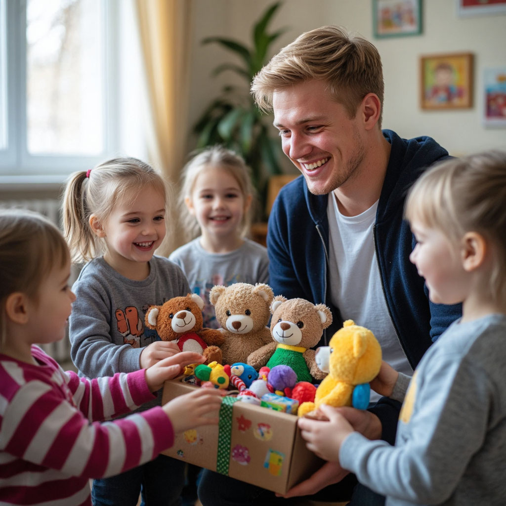 Раздав каждому ребёнку по большой новенькой игрушке, Лёша хотел было уже отправиться по своим делам, но вдруг от детей посыпались вопросы.