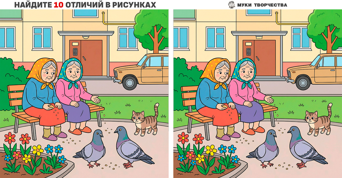 Сегодня задачка на внимание происходит в уютном дворике спального района. На двух похожих картинках, где бабули кормят голубей, посматривая на хитрого кота. В одной картинке художник сделал 10-ть небольших отличий. Попробуйте самостоятельно найти все отличия. Это не просто развлечение, а полезное упражнение на концентрацию внимания и память. В эпоху клипового внимания, такие упражнения будут полезны не только людям в возрасте, но и молодым людям. Как обычно я поместил ответ в конце статьи, на случай если у вас возникнут сложности в поиске. Но лучше используйте его для проверки своих результатов. Хочу напомнить, если вам нравятся материалы с канала «Муки творчества», то вы всегда можете поддержать автора. Буду рад любой помощи: лайки, комментарии, рекомендация материалов своим друзьям и донаты (даже небольшая сумма мотивирует развивать канал и выпускать больше материалов). Спасибо всем за помощь в развитии канала! Горизонтальная версия задачки: У подъезда Вертикальная версия задачки: У
