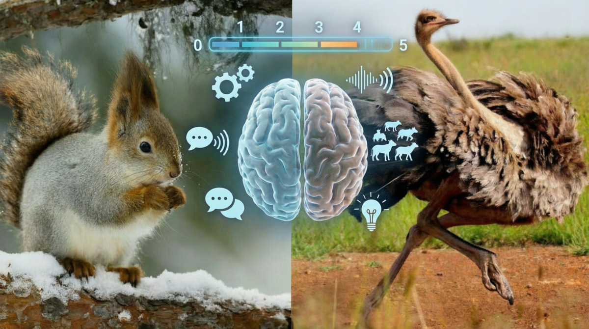 Оценивать будем по пятибалльной шкале, где 0 — способность не выявлена, а 5 — уникальный талант, подтверждённый множеством исследований. Важное предупреждение: баллы в этом сравнении нельзя переносить на другие статьи — в каждом сравнении мы по-разному настраиваем фокус, чтобы ярче высветить уникальные способности именно этой пары. Белка — 3 балла. Мозг белки — это совершенный инструмент для её среды, но по количеству нейронов и сложности коры он уступает лидерам животного мира. Страус — 1 балл. Крайне низкий EQ и примитивная архитектура мозга дают фору птицам из группы Neoaves. Но, как мы увидим дальше, размер — не главное. Белка — 3 балла. Отличное понимание физики предметов, подтвержденное экспериментами. Они блестяще решают задачи на извлечение еды из сложных контейнеров, нажимая на рычаги и понимая механизмы. Страус — 4 балла. Триумф технической мысли! В эксперименте с прозрачным контейнером, где еда была спрятана в ячейках под вращающейся крышкой, страусы и нанду не стали играть