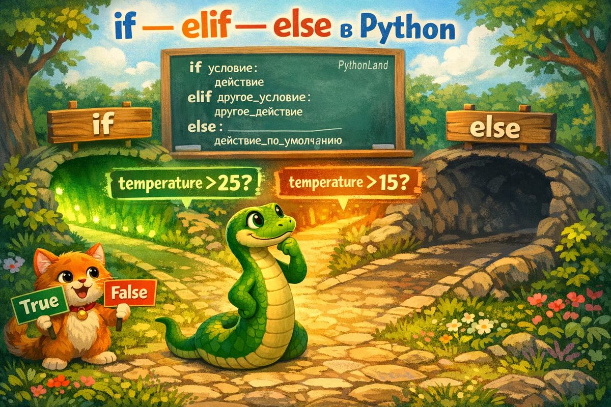 Это основа управления в Python. С неё начинается настоящая логика программы. В этом уроке разберём, как работают if, elif и else, и научимся строить понятные и аккуратные условия. if переводится как «если».