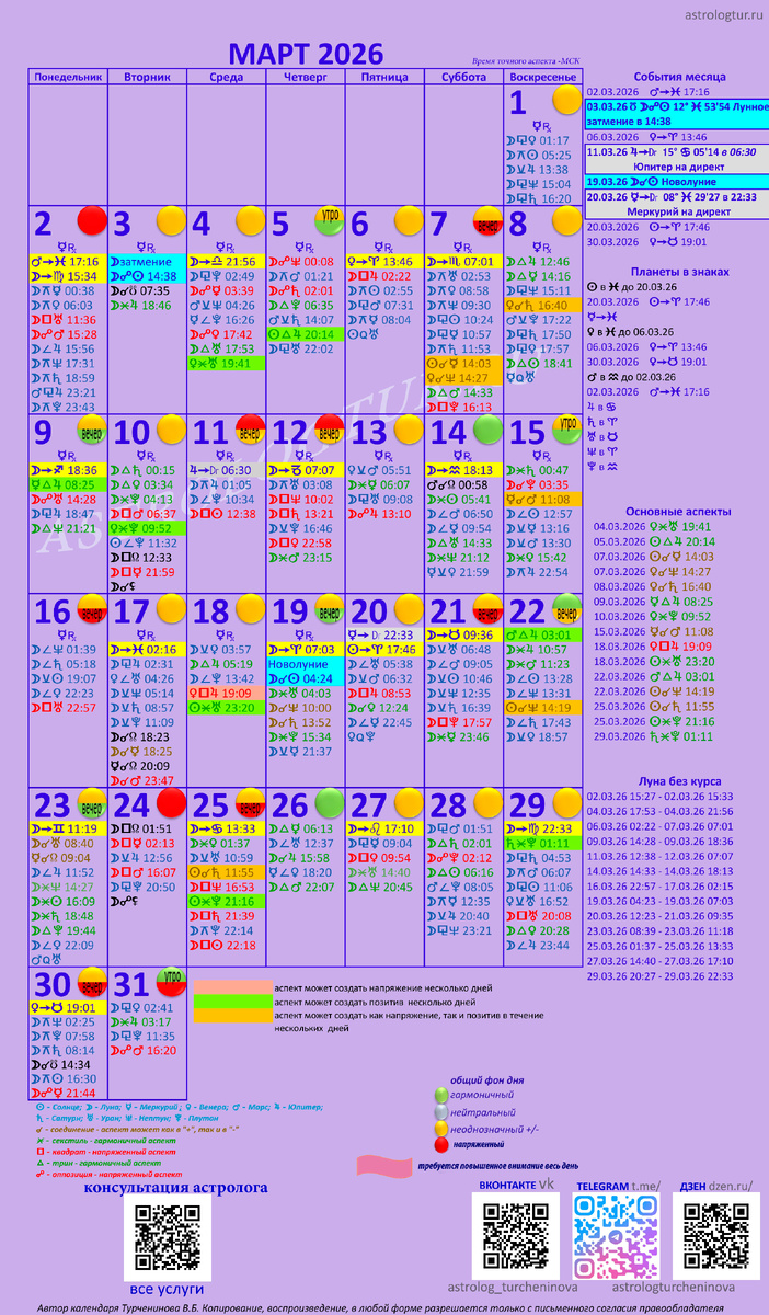 В астрологическом календаре приведены все ингрессии (переходы в другой знак) планет в течение месяца, что также является весьма существенным при определении благоприятный период или нет.