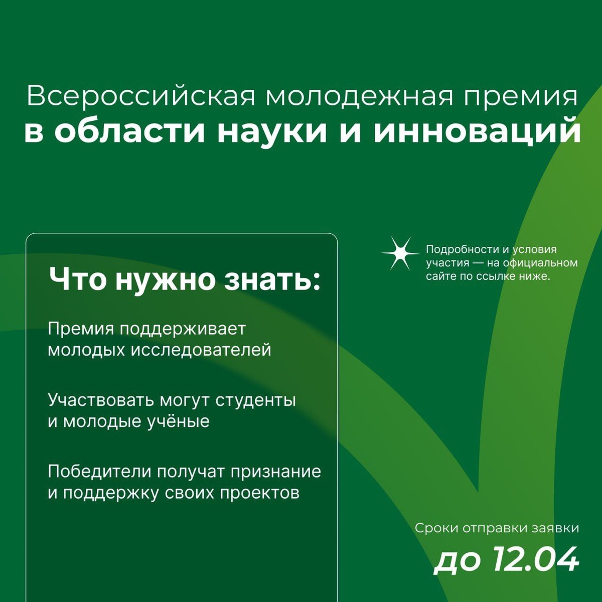 ! Открыт приём заявок на Всероссийскую молодежную премию в области науки и инноваций для студентов бакалавриата, специалитета и магистратуры. Что нужно знать: • Премия поддерживает молодых исследователей • Участвовать могут студенты и молодые учёные • Победители получат признание и поддержку своих проектов 📅 Дедлайн: подать заявку можно до 12 апреля 2026 года 🌐 Подробности и условия участия — на официальном сайте: research.misis.ru/youth_award Контакт для вопросов: Наталья Сергеевна Кутырева, главный специалист по проектной деятельности НИТУ «МИСИС» 📞 +7 (928) 602-79-25 📧 kutyreva.ns@misis.ru Если у вас есть научный проект, исследование или инновационная разработка — не упустите возможность получить заслуженное признание! 🚀 #СПбГЛТУ #СПбГЛТУ_возможности 👻 МАХ | 💙 ВК | 📝 ДЗЕН