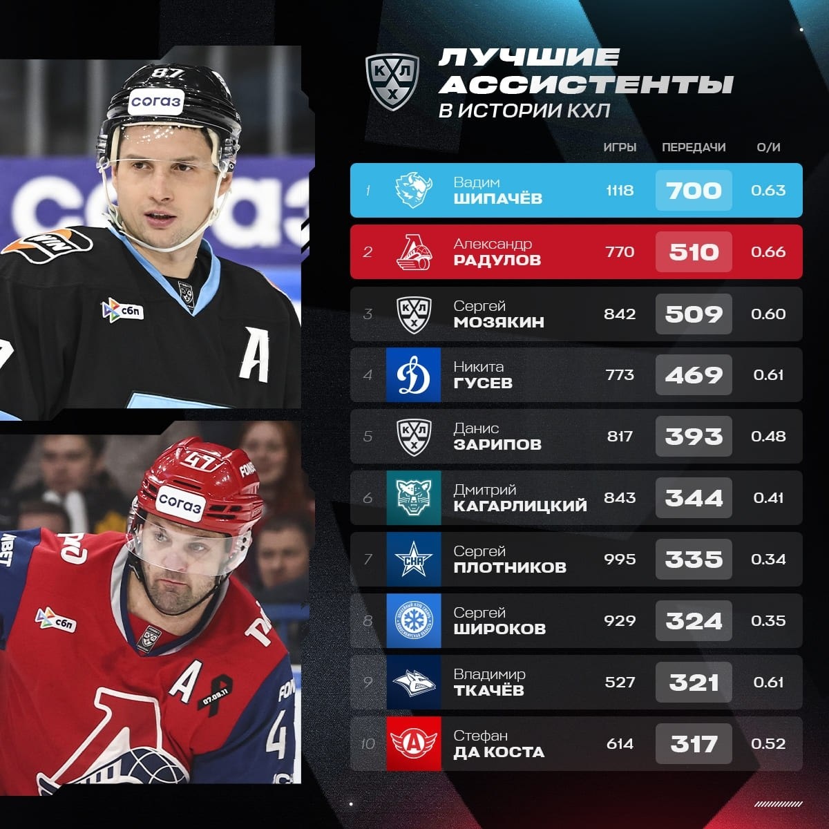 ? Чтобы обогнать Вадима Шипачёва его ближайшему преследователю, Александру Радулову, нужно делать в среднем по одному ассисту в каждом матче на протяжении трех регулярных сезонов. А идущему на 9-м месте Владимиру Ткачёву потребуется отдать столько же передач, сколько он сделал за 11 сезонов в КХЛ (и добавить еще 58 пасов). #хоккей #спорт