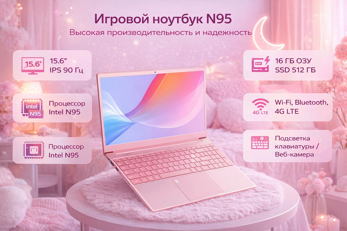 Всем привет ! Вы на канале электроник, а значит будете в курсе самых интересных новинок и надежной классики в мире гаджетов. Скажу честно: когда я впервые увидел «игровой ноутбук» в розовом цвете, подумал, что это очередная попытка продать дизайн вместо железа. Но потом разобрался в характеристиках, посмотрел на комплектацию и понял — история тут интереснее, чем кажется. Сегодня разбираем N95 — модель с 15,6-дюймовым экраном 90 Гц, 16 ГБ оперативной памяти и SSD на 512 ГБ. И да, с подсветкой клавиатуры. Поговорим без иллюзий, но так, чтобы было понятно, кому он реально подойдёт. Последние годы рынок ноутбуков сильно изменился. Производители начали массово выпускать устройства на базе энергоэффективных процессоров Intel серии N. Это попытка сделать технику, которая не греется как печка, не шумит как самолёт и стоит заметно дешевле классических игровых машин. Intel N95 — представитель нового поколения чипов. 4 ядра, современная архитектура, оптимизация под повседневные задачи, обучение,