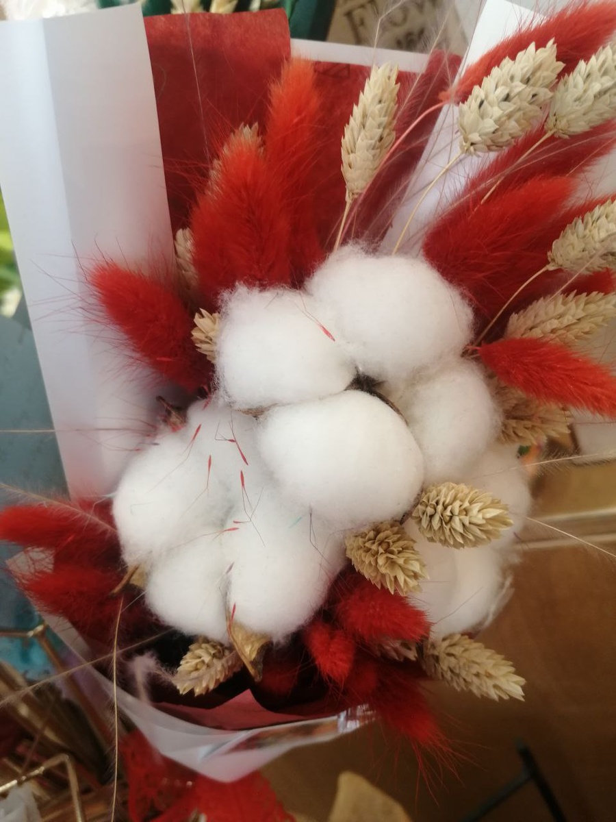 - сухоцветы (хлопок, лагурус, колоски пшеницы/ржи);