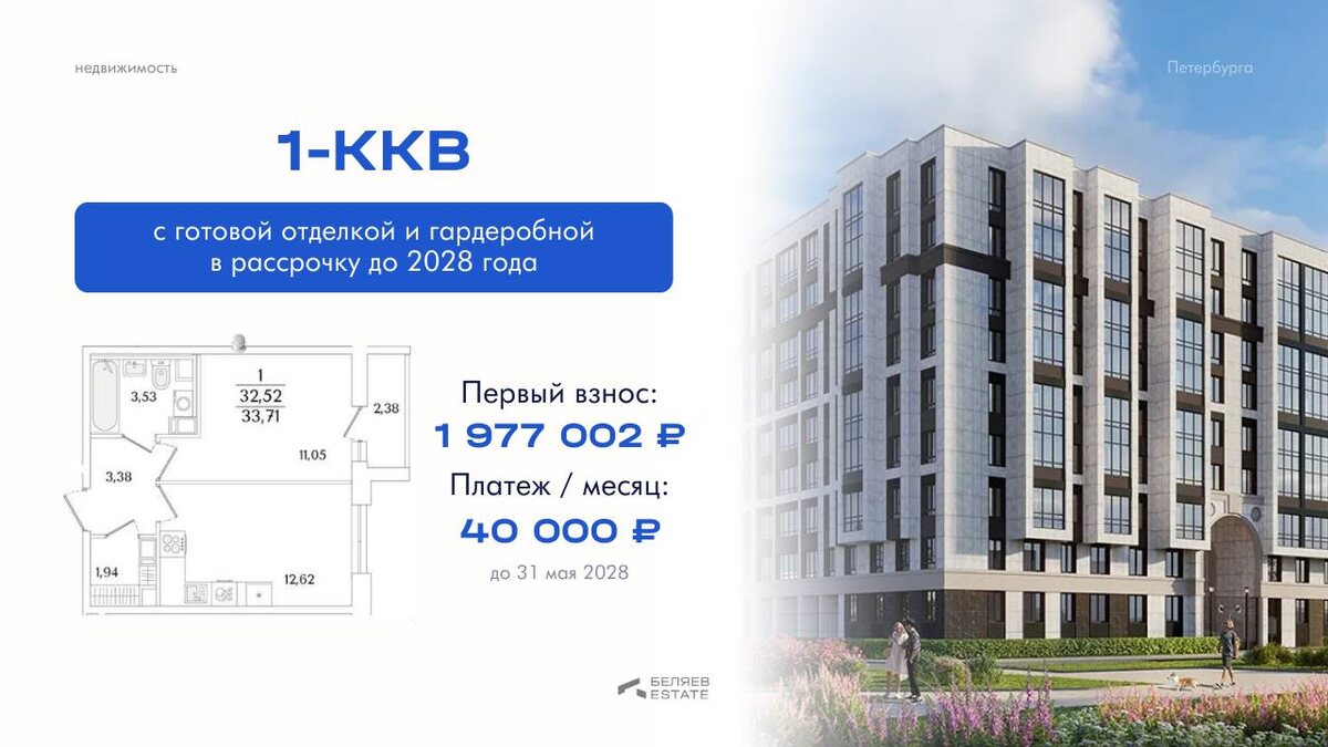 Однокомнатная квартира с готовой отделкой и гардеробной в Красносельском районе. Расчёт: ▪️первый взнос — 1 977 022 ₽ ▪️ежемесячный платёж — 40 000 ₽ (до 31 мая 2028) ▪️остаток — 10 123 000 ₽ (можно перевести в ипотеку или погасить целиком) Почему это классный вариант: 🏡 Готовая отделка — не нужно вкладываться в ремонт 👗 Гардеробная — продуманная планировка, где всё на своих местах 🏙️ Красносельский район — развитая инфраструктура, парки рядом, школа и сады на территории 🚇 Удобная транспортная доступность — быстрая дорога до центра 💳 Рассрочка с комфортным платежом — платите фиксированную сумму без переплат банку 👉🏻 Оставьте заявку — расскажем подробнее и зафиксируем условия рассрочки