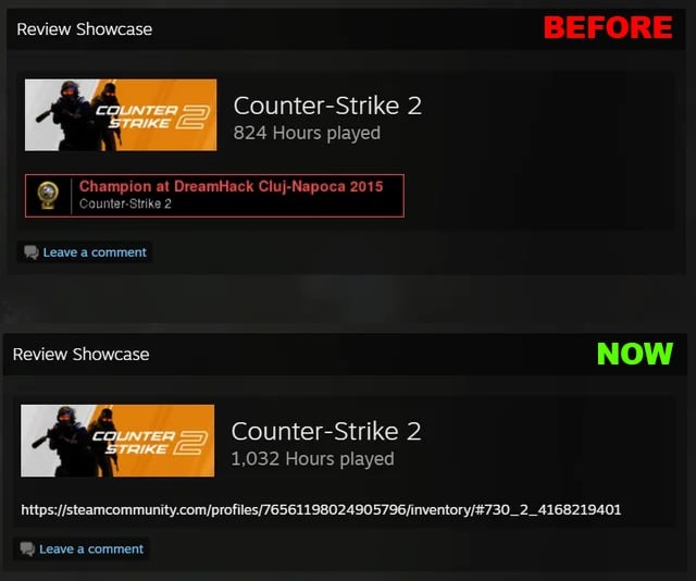 Раньше по ссылке в витрине отображался настоящий внутриигровой трофей, что позволяло злоумышленникам вводить пользователей в заблуждение. Теперь вместо трофея показывается только URL. Ну и без бага тут не обошлось. Из-за этого обновления сломалось отображение встраиваемых предметов в профиле. 👍 Esports.ru | CS