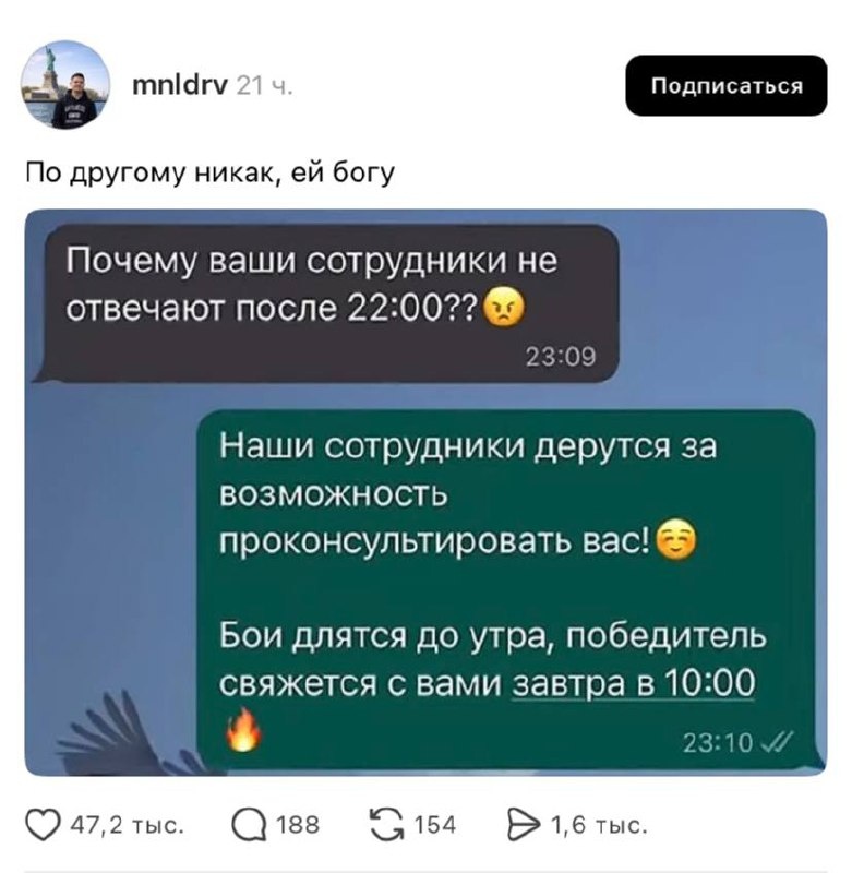 праздникам и т.п. (мой герой - чел позвонил по парсингу 31.12 около 19.15 вечера)... Сегодня позвонили около 8.10 утра и попросили парсить сайт, было негодование, когда я попытался намекнуть, что еще слегка рано и мы начинаем работу с 10.00 :) Русский ИТ бизнес