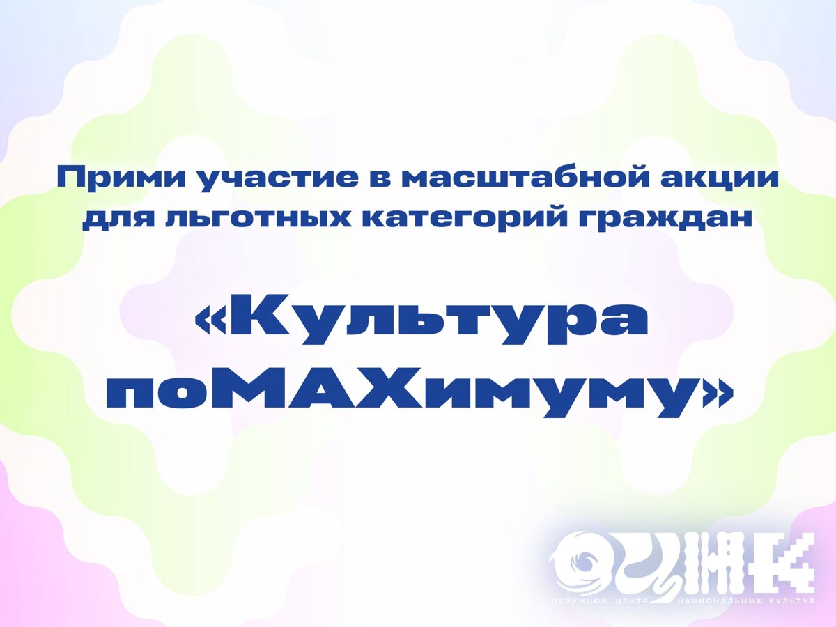 ! Окружной Центр национальных культур присоединяется к акции «Культура поМАХимуму». До 1 марта льготные категории граждан могут посещать наш кинотеатр и мероприятия бесплатно или со скидкой - достаточно показать цифровой ID в мессенджере MAX. Кто может воспользоваться: ✅ студенты ✅ пенсионеры ✅ многодетные семьи ✅ люди с инвалидностью Как пройти по акции: 1️⃣ Откройте MAX ➡️ раздел «Цифровой ID» 2️⃣ Покажите QR‑код на входе ➡️ мы отсканируем его через «Госкан» Ознакомиться со списком доступных мероприятий можно на портале «Культура.РФ» в специальном разделе «Культура поMAХимуму». Ждем вас в гости! Проведите время с пользой и культурно 🌟 #Салехард #ОЦНК #КультурапоМАХимуму #ЯНАО #КультураЯмала