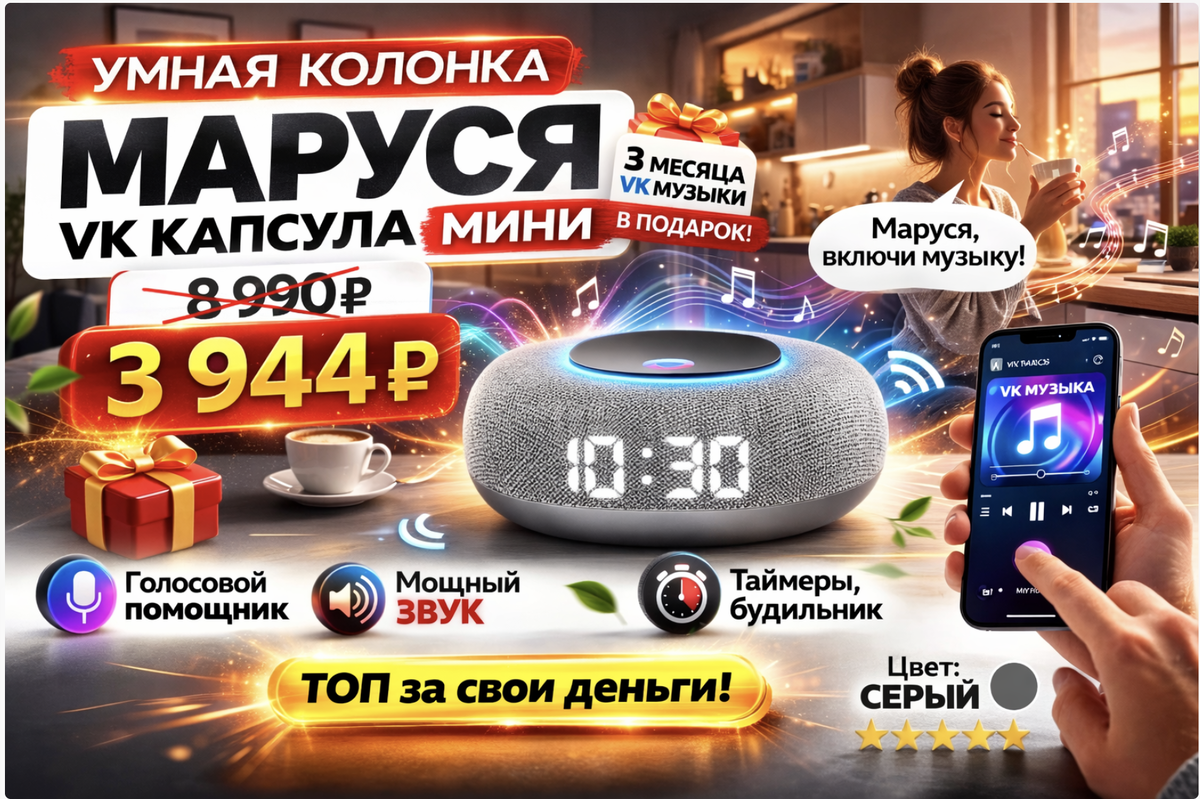 Я не гик и не фанат умного дома. Я обычный человек, который устал постоянно тянуться к телефону, чтобы включить музыку, поставить таймер или узнать погоду. Долго думал, нужна ли вообще умная колонка. Казалось, это игрушка. Но когда увидел VK Капсулу Мини с Марусей за 3 944 ₽ (вместо 8 990 ₽) — решил попробовать. И вот что получилось. У меня была простая Bluetooth-колонка. Музыку играла — и всё. Но каждый раз:
