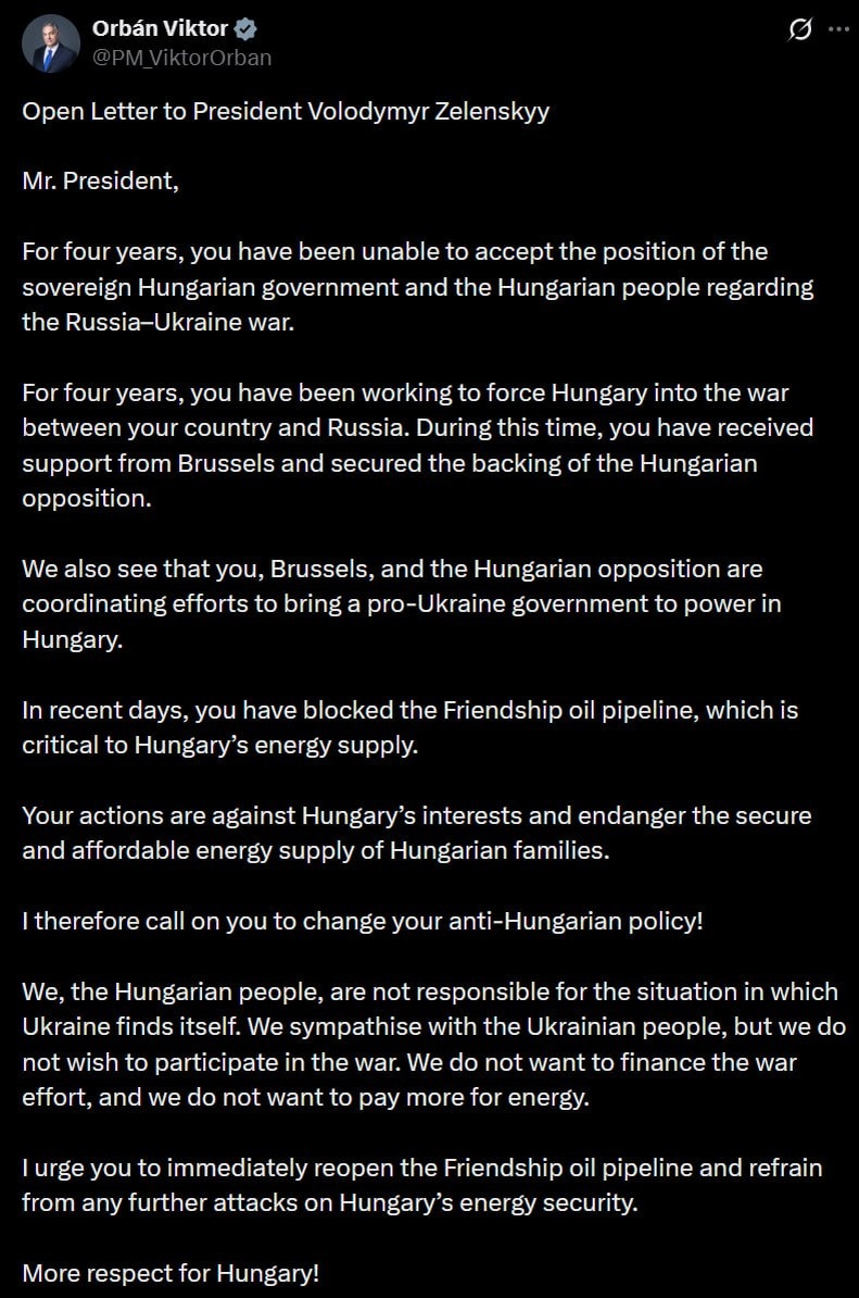 : Открытое письмо президенту Владимиру Зеленскому Господин Президент! На протяжении четырех лет вы не можете принять позицию суверенного венгерского правительства и венгерского народа в отношении российско-украинской войны. На протяжении четырех лет вы пытаетесь втянуть Венгрию в войну между вашей страной и Россией. За это время вы получили поддержку Брюсселя и заручились поддержкой венгерской оппозиции. Мы также видим, что вы, Брюссель и венгерская оппозиция координируете усилия, чтобы привести к власти в Венгрии проукраинское правительство. В последние дни вы заблокировали нефтепровод «Дружба», который имеет критически важное значение для энергоснабжения Венгрии. Ваши действия противоречат интересам Венгрии и ставят под угрозу надежное и доступное энергоснабжение венгерских семей. Поэтому я призываю вас изменить вашу антивенгерскую политику! Мы, венгерский народ, не несем ответственности за ситуацию, в которой оказалась Украина. Мы сочувствуем украинскому народу, но не желае