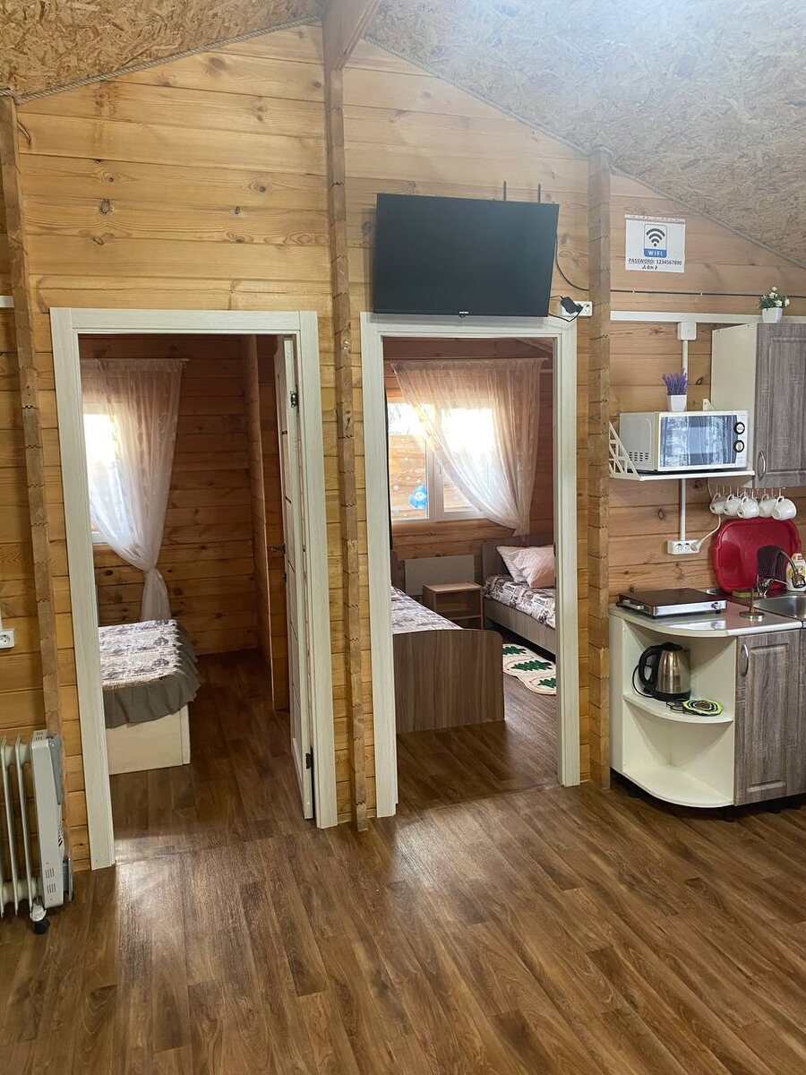 * Гостиная-трансформер: Объединена с полностью оборудованной кухней (посуда, микроволновка, электрическая плитка, чайник). 2 удобных дивана.