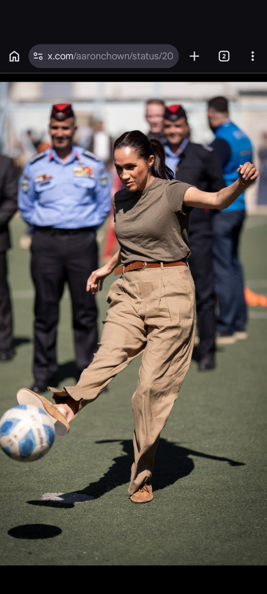 Супер-мать двоих детей выбрала широкие брюки с высокой талией, подчеркнутые поясом, и подходящую по цвету футболку с короткими рукавами, напоминающие цвета военной формы армии Израиля. Мировая звезда №1, как известно, в основном сама подбирает себе прическу, макияж и одежду, и, вероятно, без утюга, брюки герцогини, естественно, выглядели мятыми. Но у неё явно не было времени беспокоиться о складках, и вместо этого она с гордостью сосредоточилась на своей важной работе в Иордании. В подтверждение того, на чем она сосредоточена, герцогиня, похоже, сохранила мятые брюки в качестве части своего третьего наряда за день, лишь сменив футболку на более элегантную черную блузку с выразительными плечами.