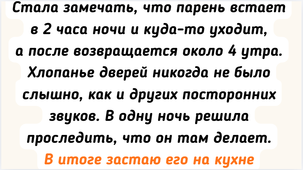 - Стала замечать, что парень встает в 2 часа ночи и куда-то уходит, а после возвращается около 4 утра. Хлопанье дверей никогда не было слышно, как и других посторонних звуков. В одну ночь решила проследить, что он там делает. В итоге застаю его на кухне с бульончиком от «доширака». Сказал, что только так в воскресенье может отоспаться. Долго ломала голову, как я чайник не слышала все это время, пока не вспомнила вечно стоявшую кастрюлю с водой на плите.
