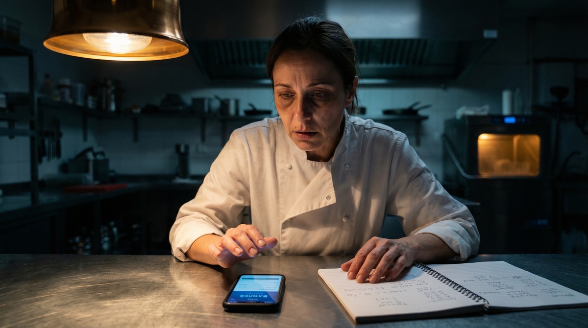 Гудела посудомоечная машина. Кухня ресторана пахла остывшим фритюрным маслом, и синий свет экрана лежал на стальной столешнице холодным пятном. Милана, повар, тридцать лет, сидела на табурете перед двумя предметами: телефон с открытым банковским приложением Романа и блокнот, исписанный суммами.