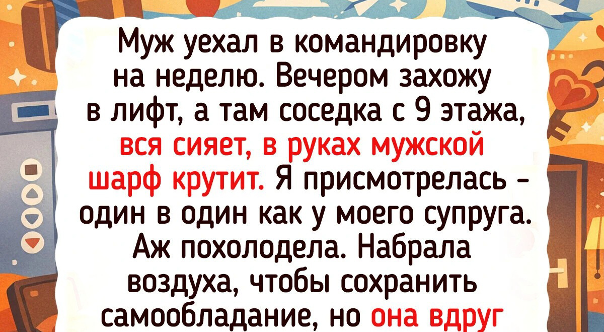Муж уехал в командировку на неделю. Вечером захожу в лифт, а там соседка с 9 этажа, вся сияет, в руках мужской шарф крутит. Я присмотрелась — один в один как у моего супруга. Я аж похолодела. Набрала воздуха, чтобы сохранить самообладание, но она вдруг протягивает мне этот шарф и говорит: «Муженек то ваш уронил его у подъезда, я все ждала, когда кого-то из вас встречу, так и таскаюсь с ним». Стыдно было ужасно за дурные мысли, но зато какой камень с души упал!