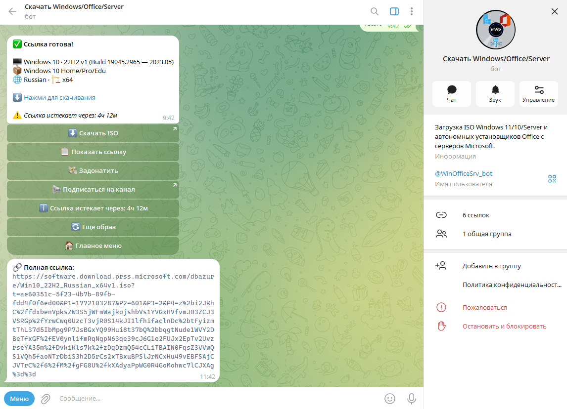 Бот Telegram @WinOfficeSrv_bot поможет скачать ISO образы Windows 11/10/Server и продукты Office по предоставленной ссылки с официального сервера Microsoft. Дело в том, что компания Майкрософт запретила пользователям из России и Беларуси загружать ISO образы с официального сайта и при помощи бота можно загрузить ISO образы по ссылке с официального сайта Microsoft. Помимо этого загрузка образов Windows по ссылке с официального сайта доступна 24 часа, потом она является не рабочей, что и привод к трудности в Интернете скачивать Windows 11/10. Бот @WinOfficeSrv_bot в телеграмме в автоматическом режиме генерирует ссылки каждые 24 часа часа для новых пользователей, что позволяет легко скачать официальные Windows 11/10 с сайте серверов Майкрософт.
