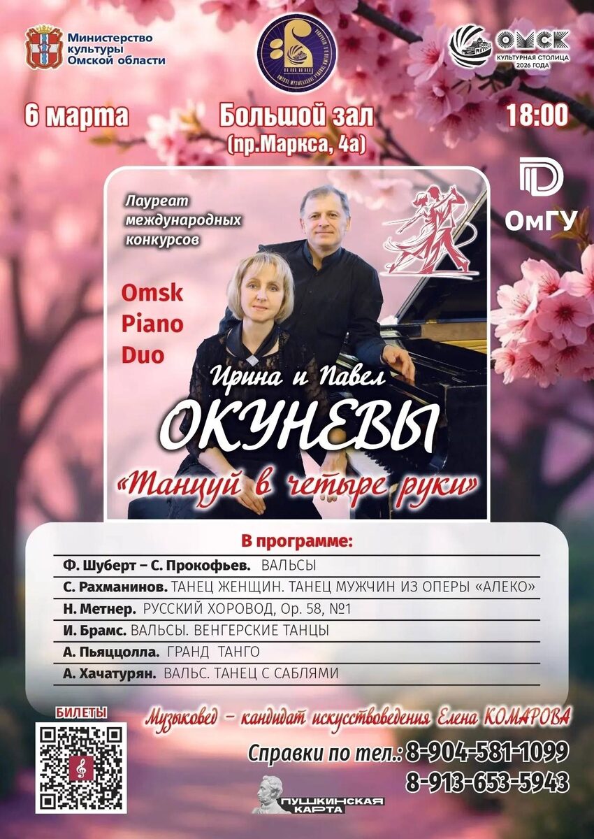 Фортепианный дуэт Omsk Piano Duo (Ирина и Павел Окуневы) представляет весенний концерт. В программе произведения Шуберта, Прокофьева, Рахманинова, Метнера, Брамса, Пьяццоллы и Хачатуряна. Музыковед - Елена Комарова. Начало: 06 марта 2026 18:00 Стоимость: 300.0 руб. Адрес: г Омск, пр. Маркса, 4а Организатор: https://vk.com/public189951361 Приглашаем на весенний концерт! 👉 Фортепианный дуэт [club145196547|Omsk Piano Duo] (Ирина и Павел Окуневы) - лауреат всероссийских и международных конкурсов, ведет концертную деятельность более 20 лет. В программе: произведения Шуберта, Прокофьева, Рахманинова, Метнера, Брамса, Пьяццоллы, Хачатуряна. ➖ Окунев Павел Анатольевич – доцент кафедры музыкального искусства факультета культуры и искусств ОмГУ; ➖ Окунева Ирина... #музыка_и_звуки_фортепиано Узнать подробности, адрес или записаться на событие.