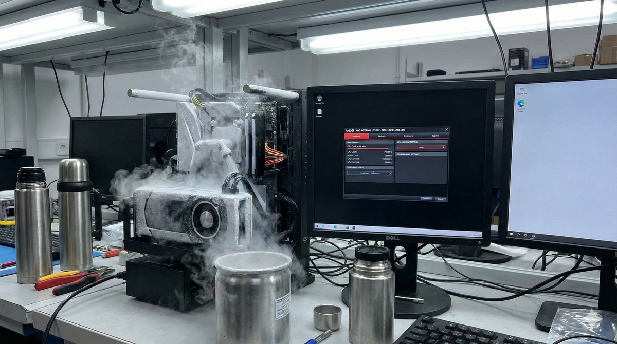 Недавно отдел маркетинга AMD буквально взорвал информационное пространство громким заявлением: установлен новый абсолютный мировой рекорд разгона графического процессора. Компания сообщила, что именитые экстремальные оверклокеры Билл Алверсон и Аллен Голиберсуч смогли выжать из новой видеокарты Radeon RX 9060 XT невероятные 4769 МГц. Учитывая, что заводская частота чипа в режиме буста составляет около 3,1 ГГц, достижение почти 4,8 ГГц под жидким азотом выглядит настоящим прорывом. Мировые профильные СМИ и техноблогеры моментально подхватили эту новость. Новостные ленты запестрели восторгами о том, как легко и уверенно пала казавшаяся неприступной планка в 4 ГГц, которую ранее с огромным трудом преодолевали на NVIDIA GeForce RTX 4090. Сообщество активно обсуждало скрытый инженерный потенциал свежей архитектуры RDNA 4, а эффектные кадры с клубами пара от жидкого азота собирали сотни тысяч просмотров. Рекорд подавался как безоговорочный триумф технологий компании. Но когда первая волна ха