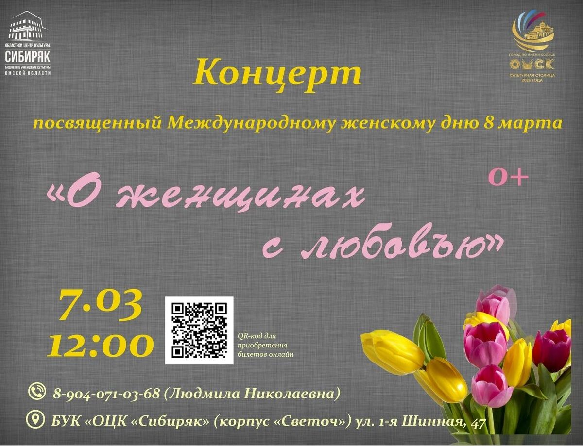 Концерт с красивыми песнями о любви в исполнении артистов и танцевальными номерами ансамбля Забава, посвященный весеннему празднику. Начало: 07 марта 2026 12:00 Стоимость: 300.0 руб. Адрес: г Омск, ул Красный Путь, д 68 Организатор: https://vk.com/public193485104 Утро в культурной столице! #Сибиряк_приглашает 7 марта в 12:00 в Областном центре культуры «Сибиряк» пройдет концерт «О женщинах с любовью». На кануне самого теплого весеннего праздника вы услышите красивые песни о любви в исполнении лучших артистов БУК «ОЦК «Сибиряк» (корпус «Светоч»). Ансамбль танца «Забава», подарит не забываемые танцевальные номера. Приходите на концерт чтобы насладиться творчеством и зарядится весенним настроением. Купить билет онлайн:https://quicktickets.ru/omsk-ock-sibiryak/s201... #развлечения_современная_музыка Узнать подробности, адрес или записаться на событие.