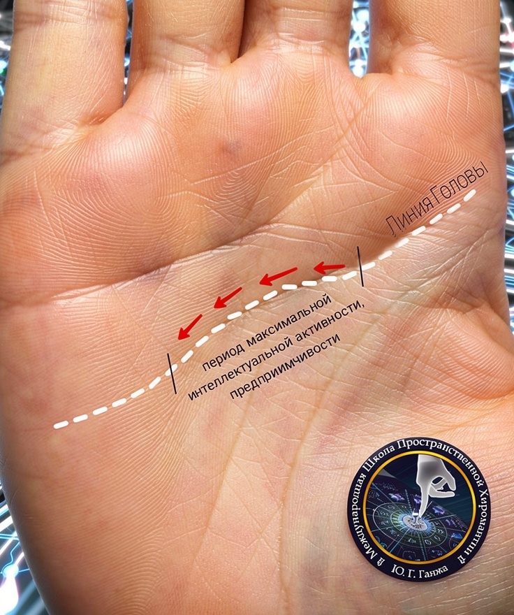 Подъем линии Головы на фоне ее общего течения, показывает период максимальной интеллектуальной нагрузки обладателя и наличия цели ради чего это делать.