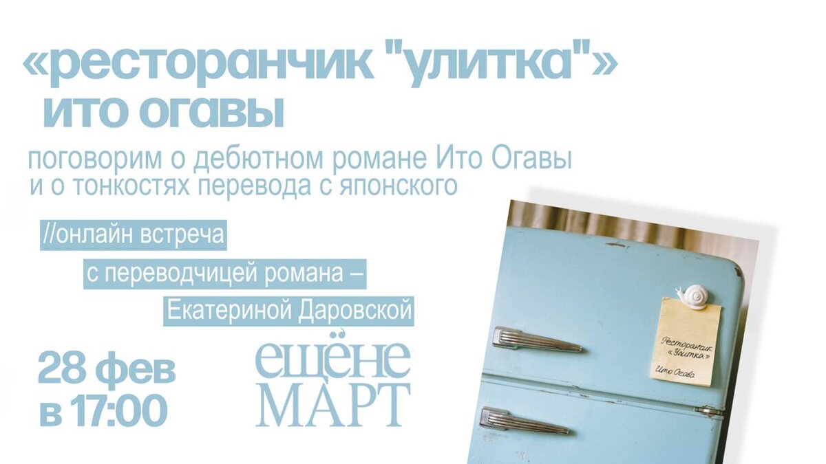 “» ✔ Онлайн-встреча с Екатериной Даровской ✔ Обсуждение перевода с японского языка на русский ✔ Разбор работы над романом «Ресторанчик „Улитка“» Ито Огавы ✔ Разговор о взаимодействии переводчика с независимым издательством ✔ Обсуждение передачи культурных и гастрономических реалий в тексте ✔ Предварительное чтение книги не обязательно 📅 Когда: #28_февраля, 17:00 ⛳ Где: Независимый книжный «Простая неформальность», г. Хабаровск, ул. Льва Толстого, 3, 2 этаж 💳 Вход свободный по регистрации Регистрация 👉 Афиша Хабаровска. Куда сходить, экскурсии