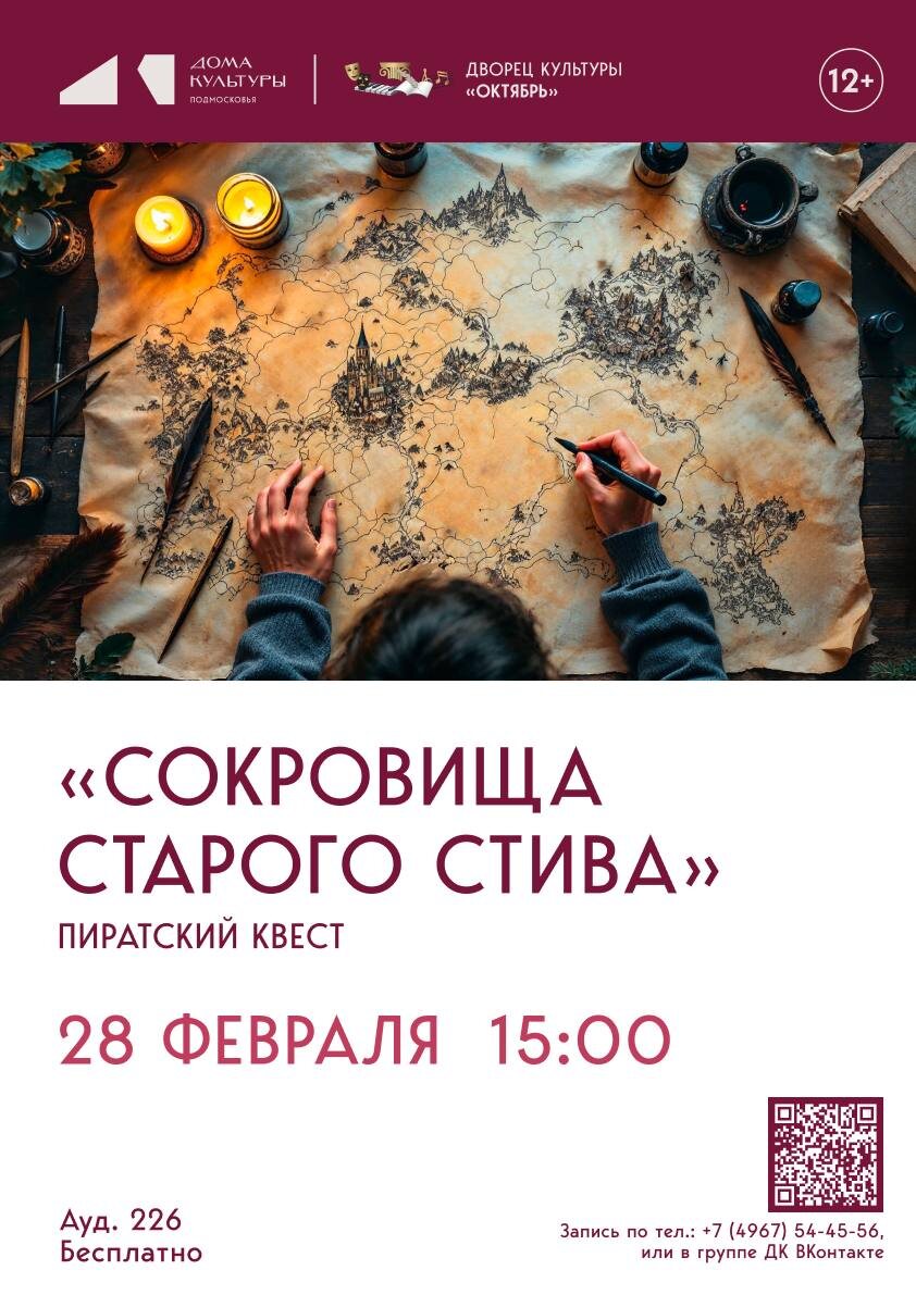 ✨ Пиратский квест 🏴☠️ Предлагаем Вам увлекательное путешествие (квест) на ОСТРОВ СОКРОВИЩ. Отгадайте загадки старого пирата и найдите сокровища, спрятанные на острове🏝 ✏️Запись по тел.: +7 (4967) 54-45-56 🚫 Возраст: 12+ 📆 28.02.2026 🕒 15:00 🏢 Дворец культуры «Октябрь» 📍 г. Подольск, ул. Свердлова, д.38 💰 Вход свободный❗️ ⭐Поддержать канал голосом 🍰Где поесть в Подольске ✅ Мероприятия Подольск https://dzen.ru/id/66ed500f7b5671493eca3fd6 http://vk.com/podolsk_events http://dzen.ru/podolsk_events