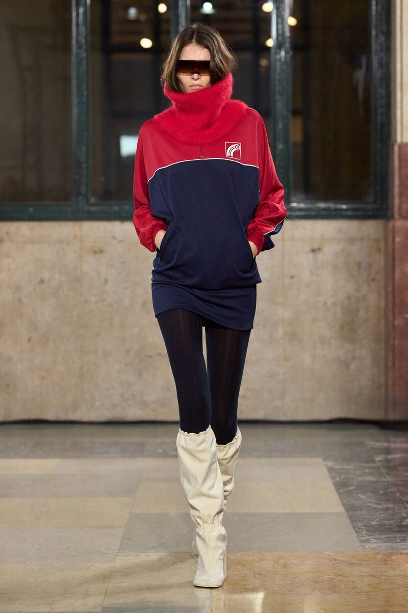 Показ прошёл в зале ожидания миланского вокзала — и это сразу задало тон коллекции: движение, повседневность, жизнь вне подиума. MM6 в этом сезоне исследует архетипы обычной одежды и делает привычное — странным, но носибельным. Подолы пальто подвёрнуты и зафиксированы кнопками, юбки-карандаши превращены в фартуки поверх длинных футболок, джинсы получили двойные пояса с эффектом «расстёгнутого» слоя. Всё выглядит знакомо — пока не присмотришься. Отсылки к 80-м читаются в силуэтах: высокая посадка, зауженные формы, объёмные юбки с рюшами, мохеровые водолазки и oversize-свитеры с цифровым логотипом бренда. Спорт встречается с офисом: колор-блок анораки и трек-куртки соседствуют с V-образными джемперами, рубашками и узкими юбками. Это коллекция о реальной городской жизни — о людях, которые после финала показа просто спускаются по мраморным ступеням и исчезают в ночном Милане. MM6 снова доказывает: интеллектуальная деконструкция может быть частью повседневного гардероба.
