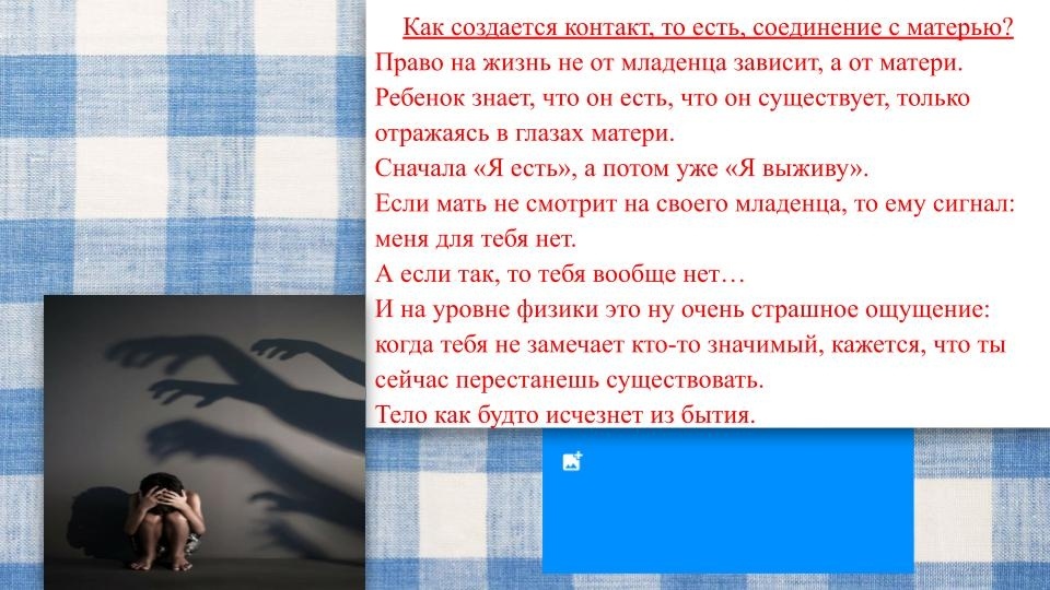 Я есть, но меня нет. Я вроде есть, но права быть у меня нет. Где и как закладывается созависимость (СЗ) вместо счастливой жизни? Что значит дать право на жизнь? Установление связи между матерью и ребенком – вот критическое условие правильного развития ребенка. Оно возникает на основе доверия между ним и матерью. Если что-то мешает процессу объединения с матерью, то ребенок может стать впоследствии созависимым и испытывать трудности с доверием. При благоприятных обстоятельствах новорожденный младенец почти с момента рождения связан со своими родителями. Звуки их голосов и лица, когда малыша держат на руках или кормят, ощущение их кожи и запаха их тел являются постоянными сигналами для ребенка, которые говорят ему о том, что в этом, на первый взгляд хаотическом и запутанном мире, существует какой-то порядок и постоянство. Ребенок знает, что он есть, что он существует, только отражаясь в глазах матери. Но бывает, что младенцу как бы даже никто права не дал: быть или не быть. Право на жиз