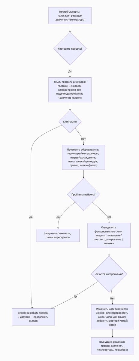 Нестабильность (surging) — это пульсации подачи, давления и температуры расплава. Сначала играем температурным профилем и режимами, затем проверяем «железо». Если не помогает — меняем конструкцию шнека/головки или ставим шестерёнчатый насос. 🤓Какие симптомы ловим - «Волна» по диаметру/толщине, полосы на поверхности. - Пульсации давления на головке, скачки расхода. - Колебания крутящего момента и тока привода. - Пульсации температуры расплава на выпуске. Быстрые действия на линии (что обычно помогает) - Уменьшить скорость шнека — меньше удельной подачи и вязкого нагрева. - Уменьшить температуру шнека (если греется) — снизить тепловой вклад в расплав. - Подправить заднюю (зону подачи) температуру цилиндра: - Понизить, чтобы усилить захват гранулы и стабилизировать твёрдую пробку. - Или поднять, если идёт проскальзывание/захват «рвётся» и возникают рывки. - Понизить температуру на конце подачи (feed end), чтобы стабилизировать твёрдотельный транспорт. - Увеличить давление головки (умен