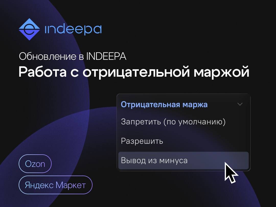 В INDEEPA обновлена настройка управления отрицательной маржой для репрайсера на Ozon. Настройка «Разрешить отрицательную маржу» переименована в «Отрицательная маржа» и теперь имеет три режима: ▪️0 - запретить (по умолчанию) Если цена приводит к отрицательной марже – отправка цен и управление акциями останавливаются. ▪️1 - разрешить Репрайсер продолжает управлять товаром даже при отрицательной марже. ▪️2 - вывод из минуса (новый режим) Если расчёт даёт минус, репрайсер автоматически поднимет цену до нулевой маржинальности. Товар не остается в убыточной цене, но для корректной работы репрайсера необходимо указать пороги цен без отрицательной маржинальности. Подобная защита так же сработает при входе товара в автоакцию. ❗️Для работы алгоритма должна быть включена отправка цен и акций. Это даёт больше гибкости: можно жёстко контролировать рентабельность, сознательно работать в минус или автоматически выводить товар в ноль без паузы в управлении. 🛍🛍 Режим доступен не только для репрайсера