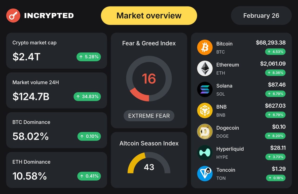 - BTC ≈$68 300 (+4.53%)