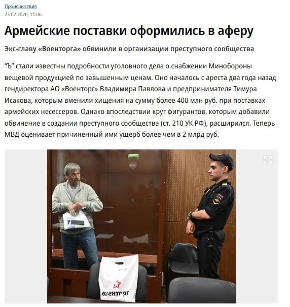 Два года назад арестовали гендиректора «Военторга» Владимира Павлова и предпринимателя Тимура Исакова (почти Иванова). Их обвинили в хищении более 400 млн руб. при поставках армейских несессеров. Сегодня сумма ущерба выросла до 2 млрд руб. — и речь уже идёт о преступном сообществе! В 2019–2022 годах Минобороны выделило около 1,2 млрд руб. на закупку несессеров — наборов с зубной щёткой, пастой, мылом, бритвой, расчёской и прочим. Но вместо прямых контрактов с производителями ведомство получало товар через цепочку посредников — по завышенным в разы ценам. Масштаб аферы: почти 2 млрд руб. похищено на поставках вещевой продукции в Минобороны. Пока солдаты в начале СВО даже стандартные наборы гигиены за свои средства покупали, кто‑то набивал карманы миллиардами...