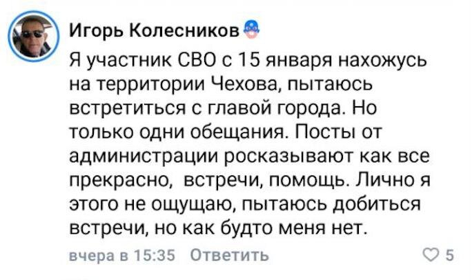 Об этом житель Чехова Игорь Колесников, вернувшийся в фронта, сообщил в редакцию “Лопасни”. “Я участник СВО с 15 января нахожусь на территории Чехова, пытаюсь встретиться с главой города. Но только одни обещания. Посты от администрации рассказывают как все прекрасно, встречи, помощь. Лично я этого не ощущаю, пытаюсь добиться встречи, но как будто меня нет”, - рассказал он. А как же все эти многочисленные заявления Михаила Собакина о том, как администрация заботиться об участниках СВО, все эти показные мероприятия, встречи, круглые столы, заботливые похлопывания по плечу, вручения грамот и благодарностей? Они для всех, или только для некоторых?
