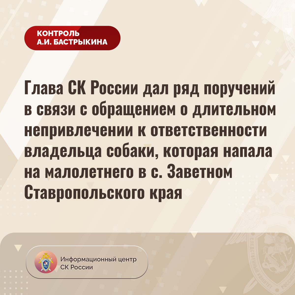 Глава СК России дал ряд поручений в связи с обращением о длительном непривлечении к ответственности владельца собаки, которая напала на малолетнего в с. Заветном Ставропольского края В сети Интернет размещено видеообращение жительницы Ставропольского края к Председателю СК России А.И. Бастрыкину по вопросу длительного непривлечения к ответственности владельца собаки, которая напала на ее малолетнего сына в селе Заветном. В 2024 году мальчик находился на территории домовладения друга, где на него набросилось агрессивное животное без намордника, причинив многочисленные травмы. Пострадавший был госпитализирован, ему потребовалось оперативное вмешательство и длительная реабилитация. Несмотря на наличие вынесенного в пользу малолетнего судебного решения, до настоящего времени компенсационная выплата семье не произведена. Обращения матери в компетентные органы результатов не принесли, владелец собаки заслуженного наказания не понес, с выводами судебно-медицинской экспертизы, установившей ле