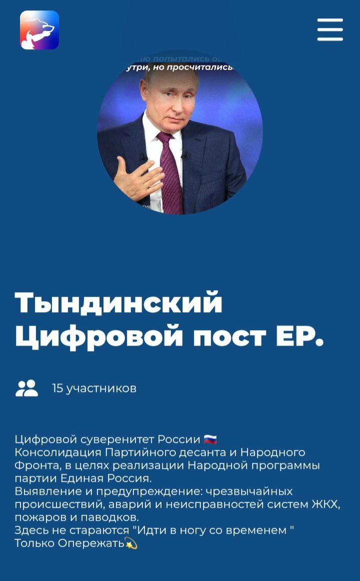 : Цифровой суверенитет России 🇷🇺 Консолидация Партийного десанта и Народного Фронта, в целях реализации Народной программы партии Единая Россия. Выявление и предупреждение: чрезвычайных происшествий, аварий и неисправностей систем ЖКХ, пожаров и паводков. Поддержка волонтерских центров СВО и помощь Зооприютам. Проведение викторин и спортивных мероприятий. Здесь не стараются "Идти в ногу со временем" Только Опережать💫 Впереди нас ждёт новый сезон, много интересных событий и условия жёсткой конкуренции 💯 Присоединяйтесь сами к нашей команде и приглашайте Единомышленников 📱📲 https://vverh.er.ru/project/3823 #ВВЕРХ.ПРО #ЕдинаяРоссия #ГородТында #АмурскаяОбласть
