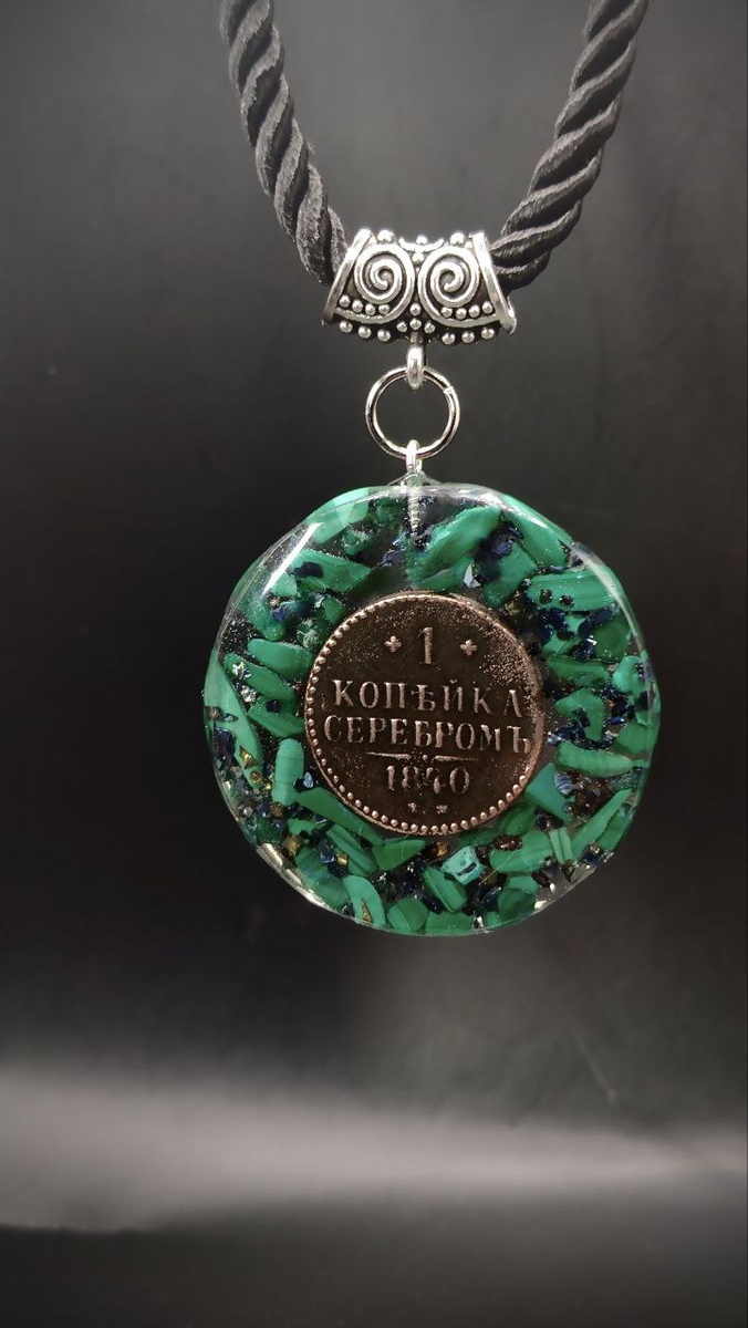 ! 1 копейка серебром 1840 года, отчеканена на Екатерининском монетном дворе при императоре Николае 1. Инкрустация Малахитом. Диаметр подвески 5см Стоимость подвески с монетой 5500р