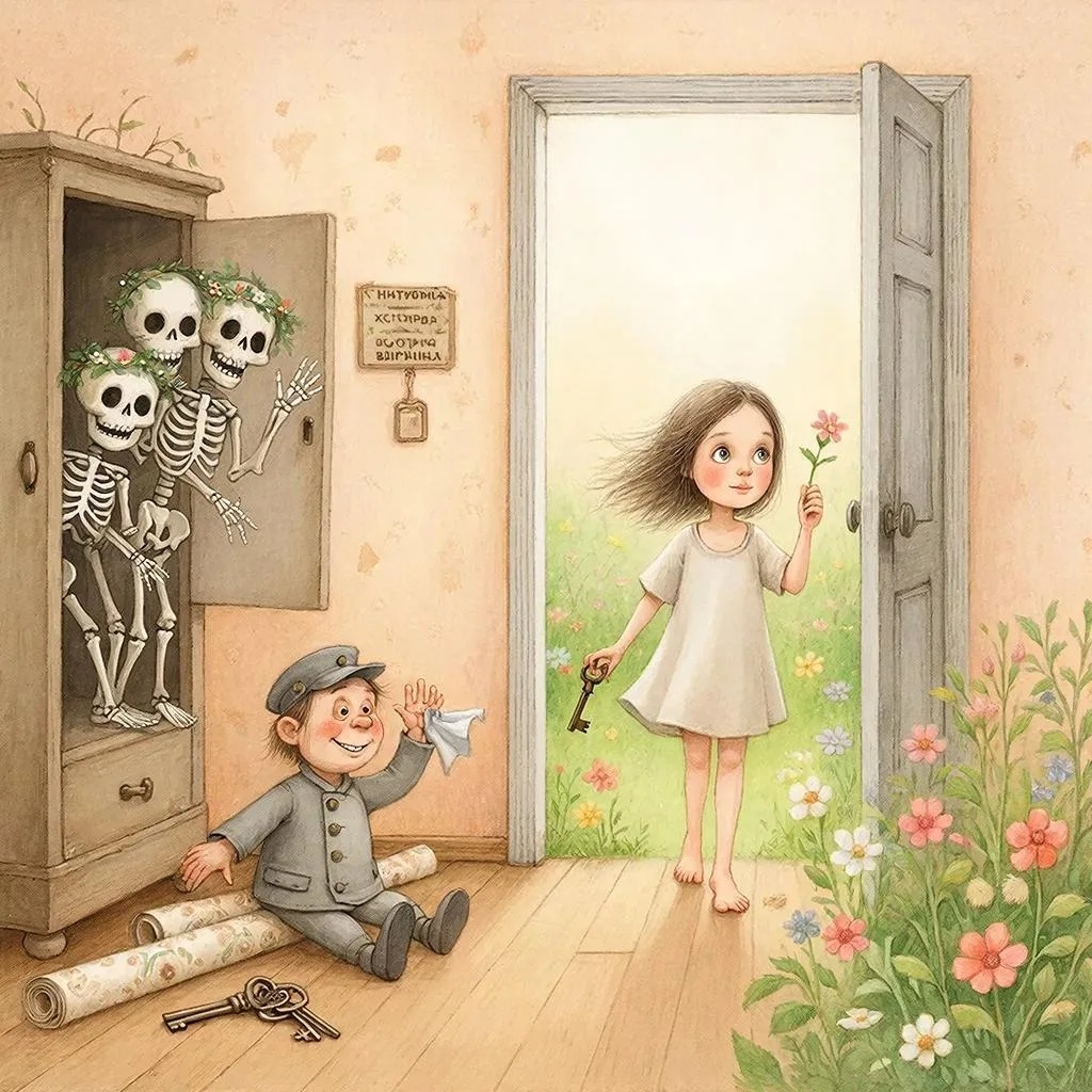 Первым делом она открыла шкаф. Оттуда вывалились все скелеты — бабушкины страхи, мамины обиды, её собственные детские слёзы. Девочка не испугалась. Она взяла каждого скелета за костяную руку и спросила: