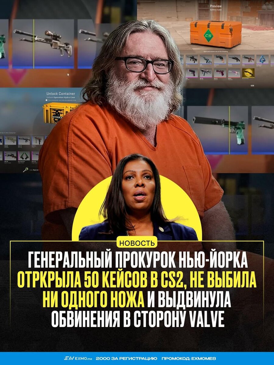 Все честно. Ген.прокурор Нью-Йорка открыла 50 кейсов и не выбила ни одного ножа, после чего выдвинула обвинения Valve, обвиняя их в скаме и «лут-боксах»🎁