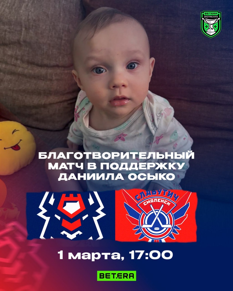 🙏 Все вырученные средства от продажи билетов на игру «Бреста» против смоленского «Славутича» 1 марта пойдут на лечение малыша! Завершающая встреча регулярного чемпионата в ледовом дворце будет благотворительной. Каждый болельщик сможет не только насладиться статусом международной игры брестской команды против смоленской, но и принять участие в добром деле. Данику 1 год и 7 месяцев, у него диагностирована СМА третьего типа. Прямо сейчас организован срочный сбор 1 815 000$ на препарат Золгенсма. Простой способ помочь – пополнить баланс МТС +375 (33) 991-01-15 или приобрести билет на игру 🎟 Ваша поддержка необходима!