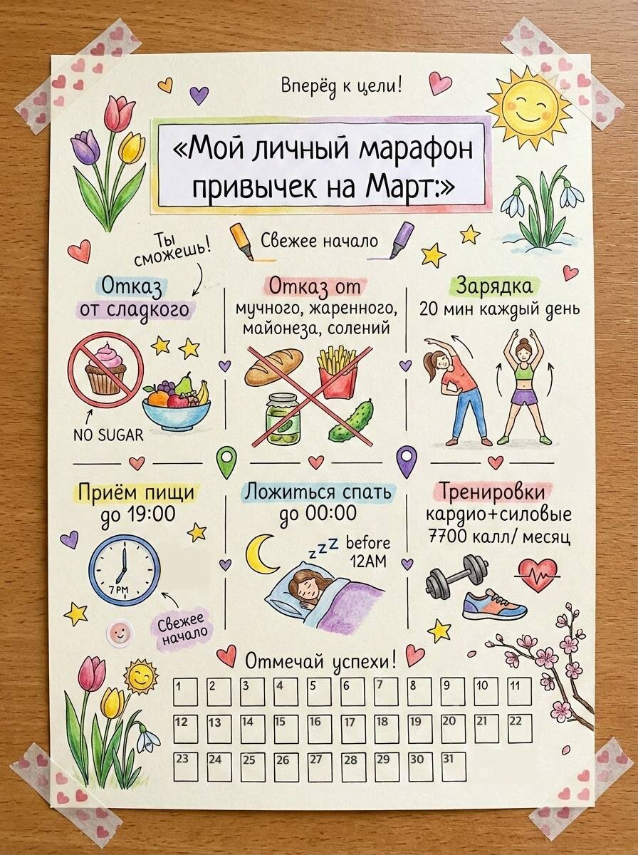 Март я хочу сделать месяцем аккуратной перезагрузки — без «рывков», без наказаний и без героизма. Я планирую свой марафон привычек и буду идти по нему с оглядкой на самочувствие. Добавлю мелкие тренировки каждый день и подключу кардио + силовые, но честно: сначала посмотрю на реакцию организма. Если почувствую, что иммунитет «сражается» и мне нужно восстановление — перенесу часть нагрузки на