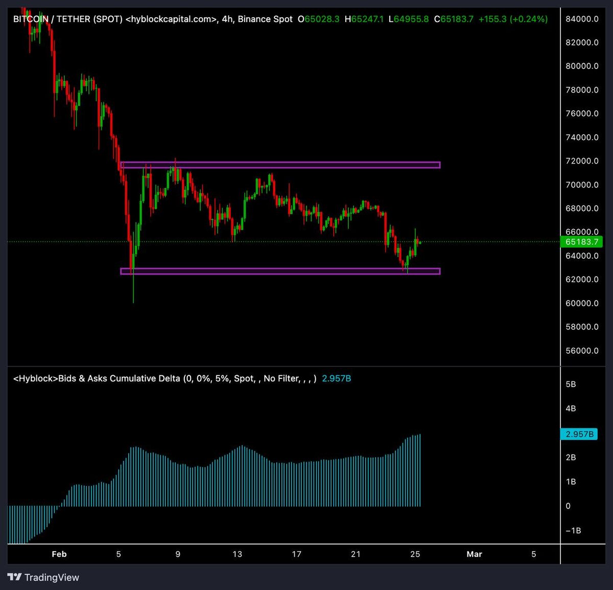 Коллеги, есть причина, почему цена сейчас не «проваливается» так же резко, как это было на 90K, 80K и 70K. В этой зоне плотный бид. В стакане стоит серьёзный слой лимитных покупок. Они поглощают продажи и уже почти три недели удерживают диапазон. На графике это выглядит как крепкий пол в районе 63–64K и потолок в зоне 71–72K. Цена тестирует низ, отскакивает, возвращается, снова тестирует. Но здесь есть важное различие, которое многие игнорируют. Лимитные ордера могут: — замедлить падение — удержать диапазон — впитать давление Но они не могут развернуть рынок. Разворот делает не пассивная ликвидность, а агрессивный спрос. Маркет-покупатели. Те, кто нажимают «купить» с рыночным ордером, с ощущением срочности. Сейчас происходит следующее: Пол тестируется → биды исполняются → покупатели оказываются в просадке → ниже снова появляются новые лимитки → процесс повторяется. Это медленное истощение. Диапазон будет жить, пока не случится одно из двух: 1. Включится агрессивный покупатель