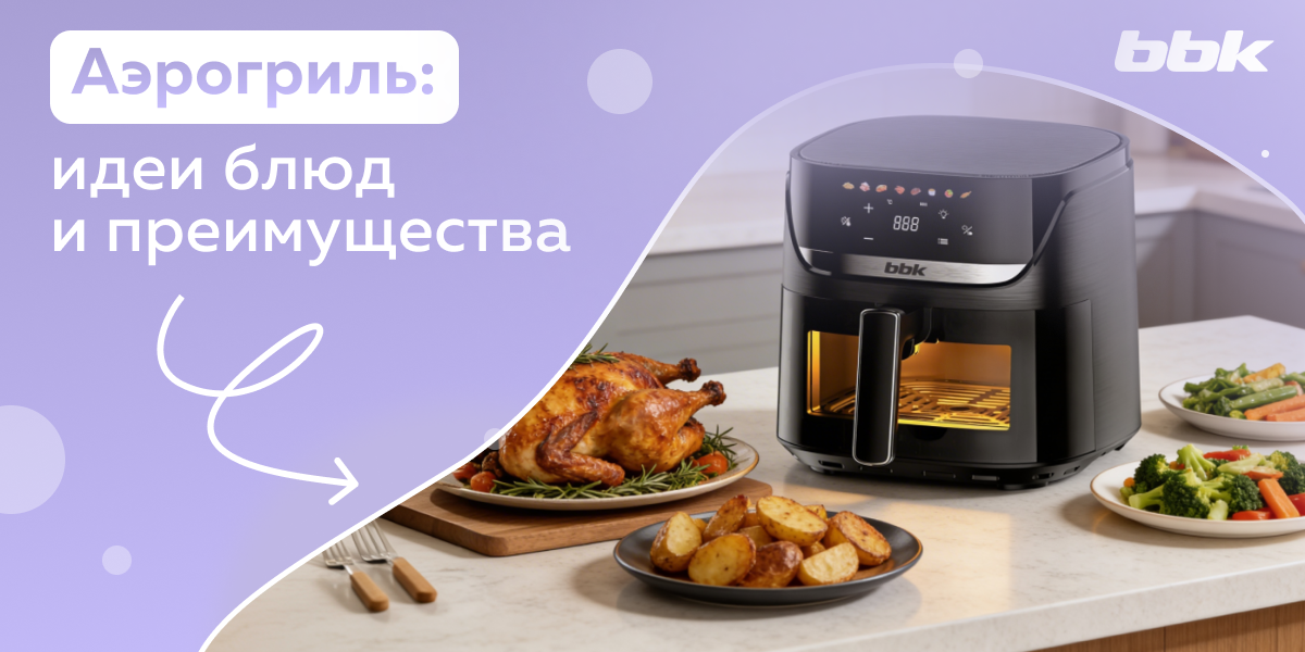 Аэрогриль давно перестал быть редким кухонным прибором. Всё больше людей выбирает его как удобную альтернативу духовке, сковороде или фритюрнице. Он помогает готовить быстрее, проще, а подчас и полезнее. Разберёмся, чем хорош аэрогриль, какие блюда в нём получаются особенно удачно и какие рецепты стоит попробовать в первую очередь. Почему удобно готовить в аэрогриле Главный принцип работы аэрогриля — циркуляция горячего воздуха. Благодаря этому продукты равномерно пропекаются и получают аппетитную корочку без большого количества масла. Например, аэрогрили BBK AF501 и BBK AF503 компактны, не занимают много места на кухне и подходят как для повседневной готовки, так и для быстрых ужинов после работы. Основные преимущества аэрогриля: 1. Минимум масла Можно готовить практически без него. Это особенно удобно для мяса, рыбы и овощей. 2. Быстрота приготовления Аэрогриль прогревается быстрее духовки, поэтому блюда часто готовятся на 20–30% быстрее. 3. Простота в уходе Чаша легко моется, а запа