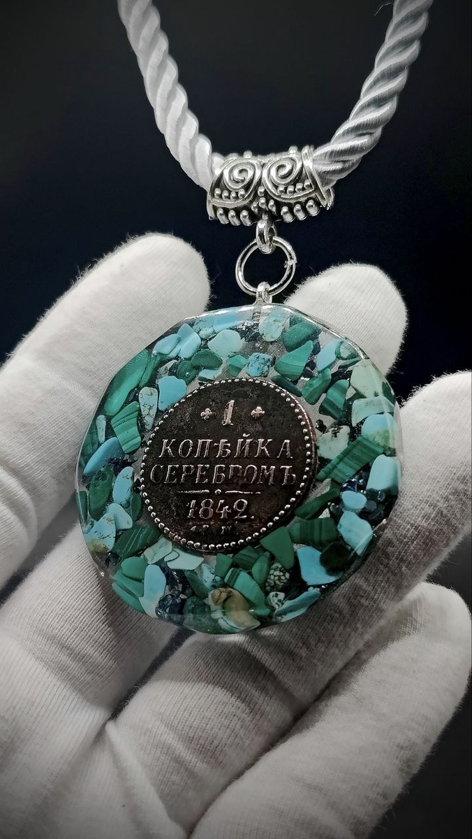 1 копейка серебром 1842 года, отчеканена на Екатеринбургском монетном дворе при императоре Николае 1. Инкрустация Малахитом и Бирюзой. Богатая композиция ❤️