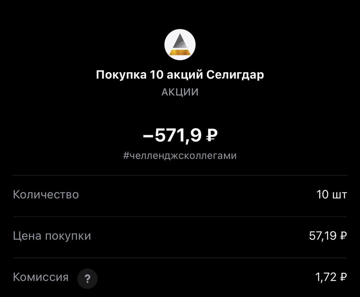 ! Покупка на сегодня #374 с учетом оставшихся денег с прошлых сделок. Статистика портфеля на стороннем сервисе, можно посмотреть по "ссылке" Напомню это челлендж с коллегами, каждый рабочий день пополняем брокерский счет на 250 рублей и инвестируем. Если возникли вопросы или есть не понимание, что делать. Задавайте «тут» Покупка #374 🟢 «Селигдар» 57.19 rub #SELG 1 лот #каждыйсможет #челенджсколлегами ✈️ Стас Мироненко
