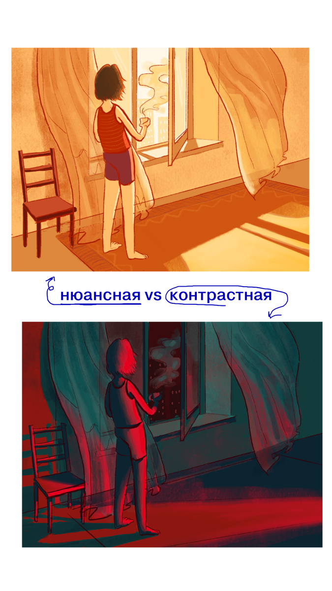 Любое классное изображение строится на основе ограниченной цветовой палитры — состоит она обычно из 4-5 цветов. Наш главный помощник в выборе цветов — теплохолодность Например, если рисуете в основном холодными фиолетовым и синим ➡️ добавьте хоть где-то тёплый оранжевый. Нюансные цвета — близкие друг к другу по цветовому кругу, с ними изображение получится нежным и задумчивым. Контрастные — противоположные на круге, например, зелёный с красным, с такими цветами можно создать напряжение, тревожность, передать яркие эмоции. Это наш любимый вариант, который мы использовали во вдохновлённой дворником Поттером иллюстрации :) Здесь мы всё изображение выполняем в чб и добавляем один акцентный цвет 🧹 Недооценённый на наш взгляд приём, который мы использовали в работе с нашей ученицей Сашей. У природы всегда гениальные решения, нужно только научиться их замечать!