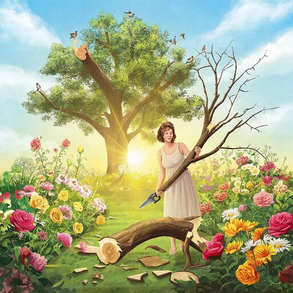 Женщина убрала ветку, перекопала землю и посадила новые цветы. Они выросли ещё красивее, чем прежде. А дерево — оно не умерло. Оно просто перестало ранить её сад.