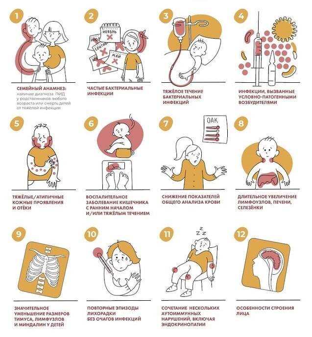 ? Это не всегда повод искать «плохой» иммунитет. Но если инфекции протекают нетипично, важно помнить о первичных иммунодефицитах (ПИД) — врождённых нарушениях работы иммунной системы. Сегодня описаны сотни вариантов, от лёгких форм до тяжёлых, требующих трансплантации гемопоэтических стволовых клеток. К счастью, ПИД встречается редко, однако распознать тревожные признаки полезно всем родителям. Признаки, которые должны насторожить: 1) семейная история — у родственников был иммунодефицит, отмечались смертельные инфекции у детей; 2) частые бактериальные осложнения — восемь и более гнойных отитов в год, две и более пневмонии или тяжёлые синуситы; 3) затяжные и «упрямые» бактериальные инфекции — необходимость антибиотиков дольше обычного, слабый эффект от терапии, частая смена препаратов, глубокие абсцессы кожи и мягких тканей, две и более генерализованные инфекции; 4) необычные возбудители и реакции на прививки — тяжёлые осложнения после живых вакцин (например, БЦЖ), стойкая кандидо