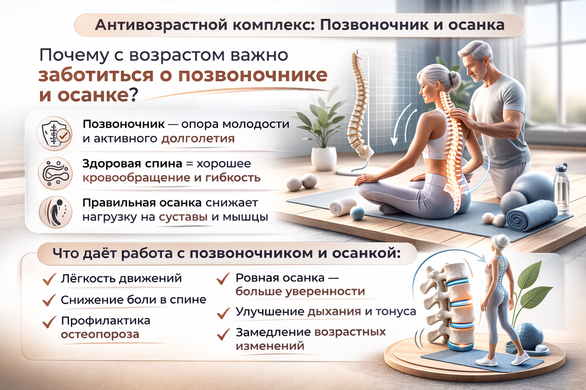 Это про: Сутулость усиливает возрастные изменения, а выстроенный позвоночник, наоборот, визуально «омолаживает» и поддерживает внутренние органы в физиологичном положении. Работая с позвоночником, мы работаем не только со спиной — мы работаем с качеством жизни.
