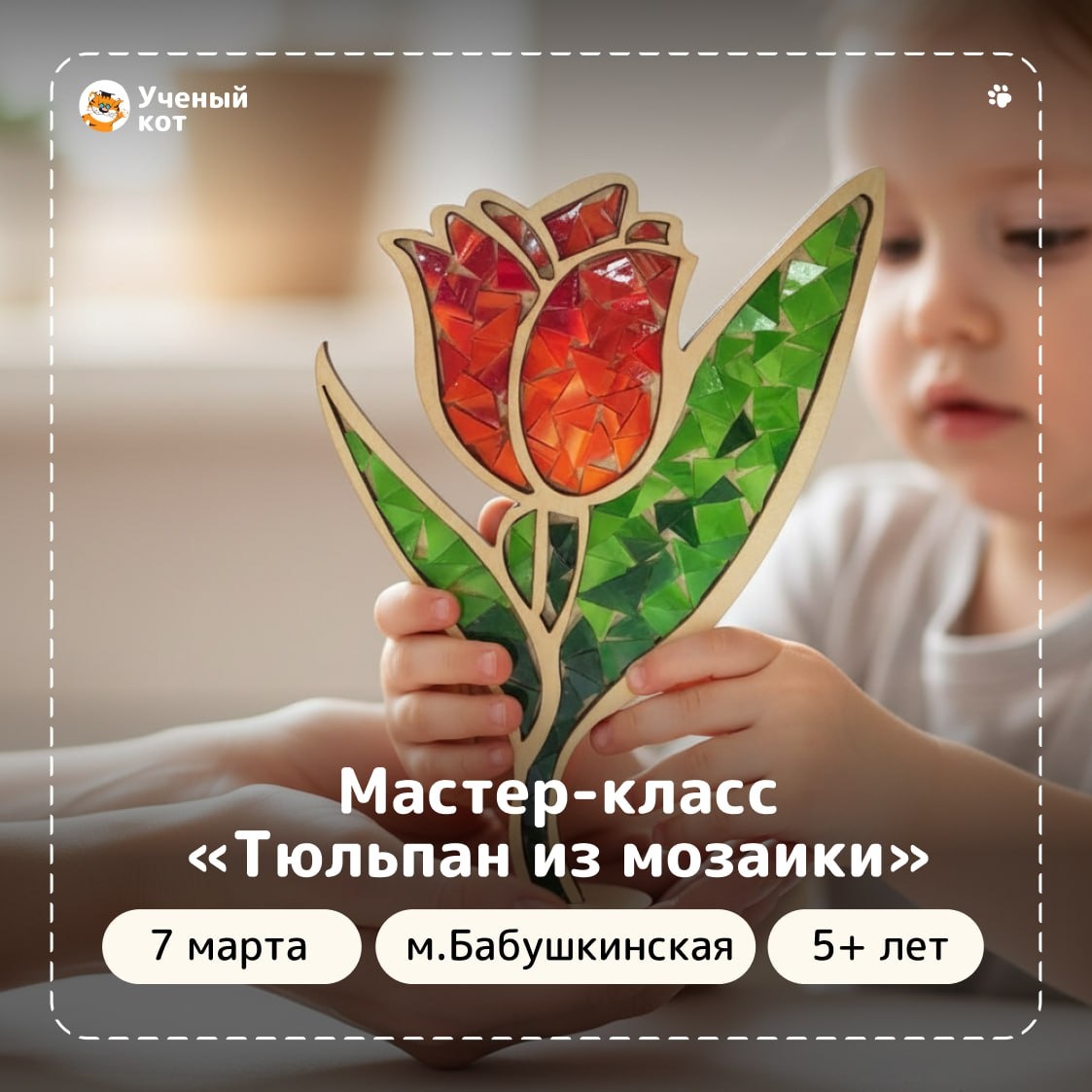 Скоро 8 марта — время дарить тепло и красоту. А что может быть трогательнее подарка, сделанного своими руками? Приглашаем детей (5+) и родителей на уютный мозаичный мастер-класс. Будем создавать яркий и объёмный цветок тюльпана в деревянной форме на подставке. 🧩 Что будем делать: Заполнять деревянную заготовку кусочками стеклянной мозаики — как пазл, только теплее и красивее. Каждый лепесток, каждый изгиб — своими руками, с любовью и вниманием. Дети дошкольного возраста набирают мозаику из заранее наколотых модулей. Почему стоит прийти: ✨ Унесёте готовый предмет интерьера или подарок, который можно подарить бабушке, маме или подруге ✨ Узнаете основы работы с мозаикой ✨ Проведёте время вместе с ребёнком за творчеством ✨ Получите удовольствие и вдохновение! 📅 7 марта (суббота) в 15:00 📍 Филиал «Учёный кот», м. Бабушкинская, ул. Искры, 9 к. 2 👧 Для детей от 5 лет и взрослых. Для всей семьи. ⌚️Длительность 1,5 часа 🎨 Стоимость 1100 руб. один участник. Всё материалы включены в сто